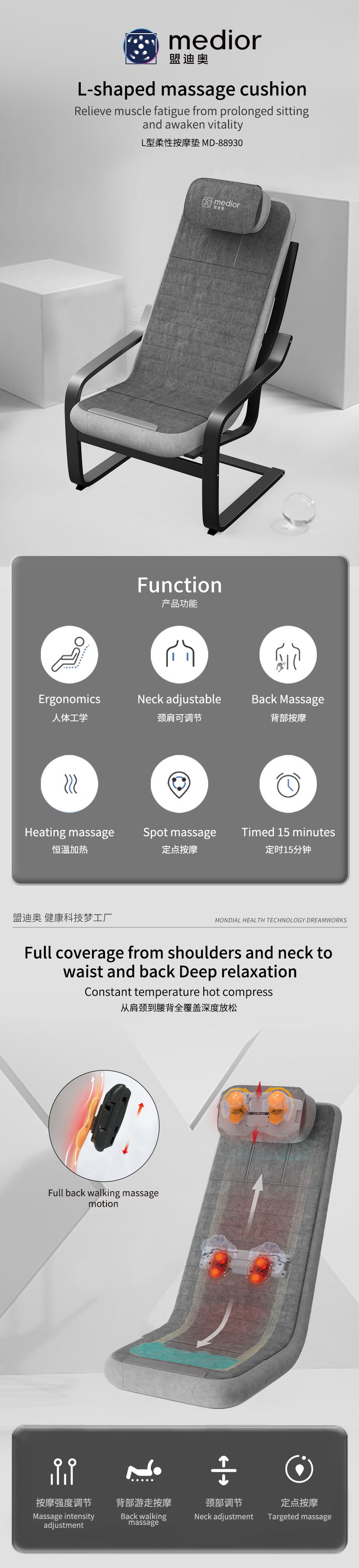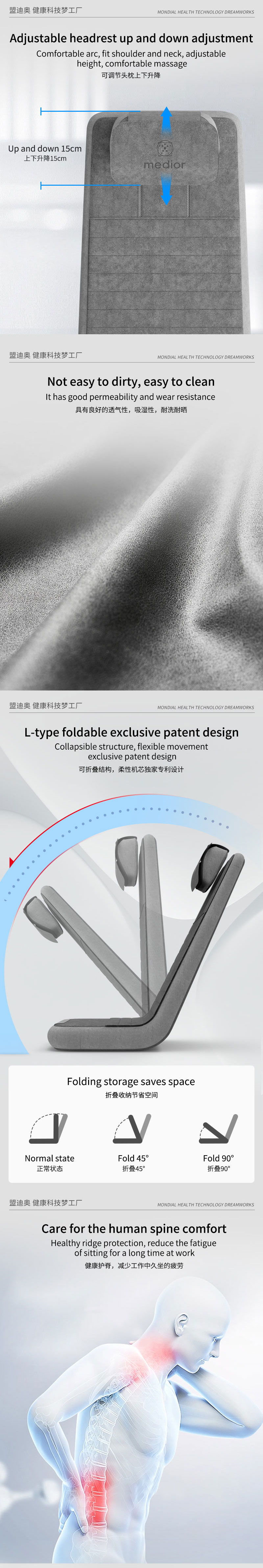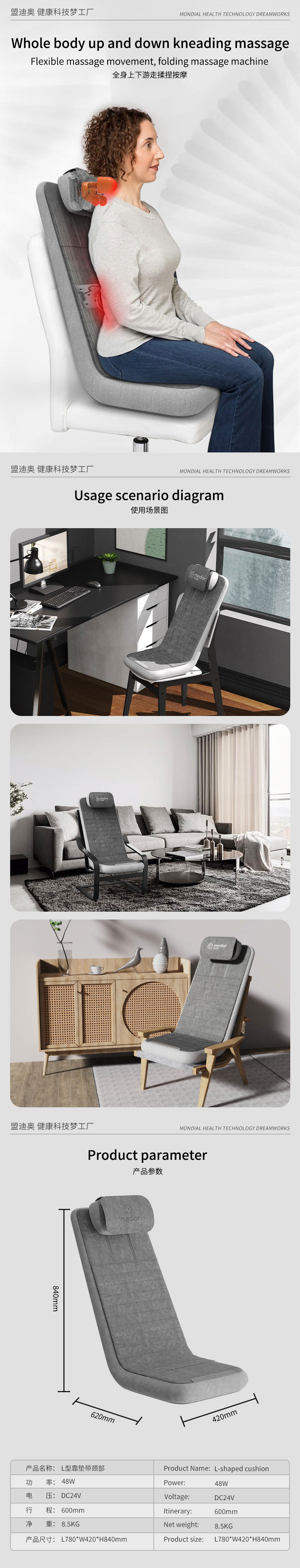 1、L型機芯結構,對折包裝縮小體積2、獨家專利柔性機芯3、力度三檔調節,定點按摩,腰背按摩、臀腿按摩、全背按摩模式選擇4、背部行走揉捏,按摩區域加長到從肩膀到大腿;5、更加貼合不同款式的椅子整體可對折收納