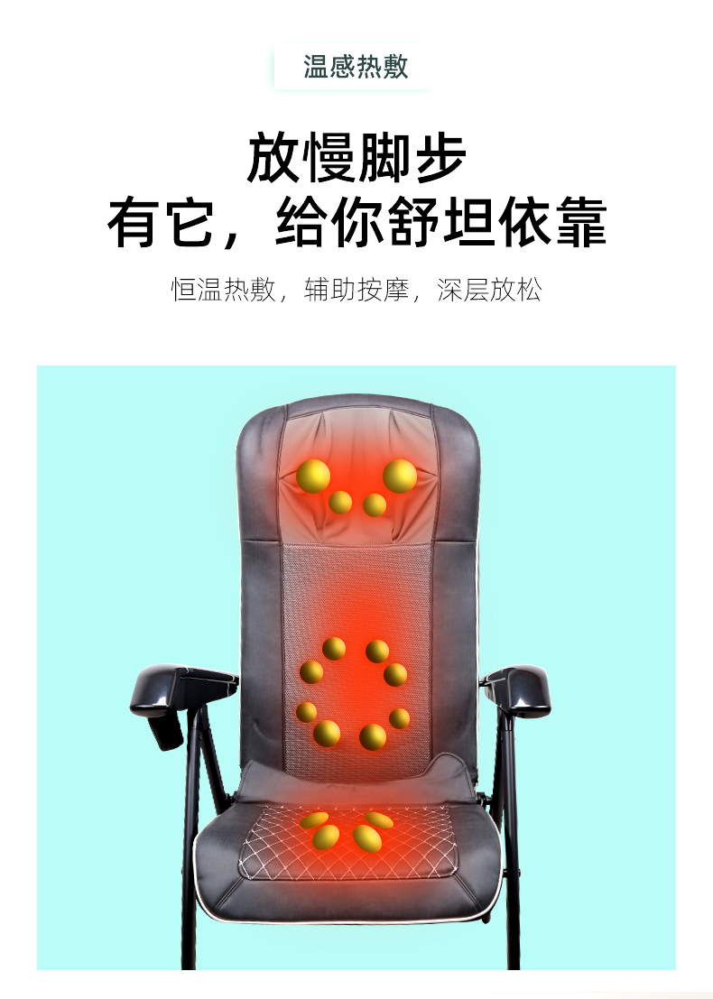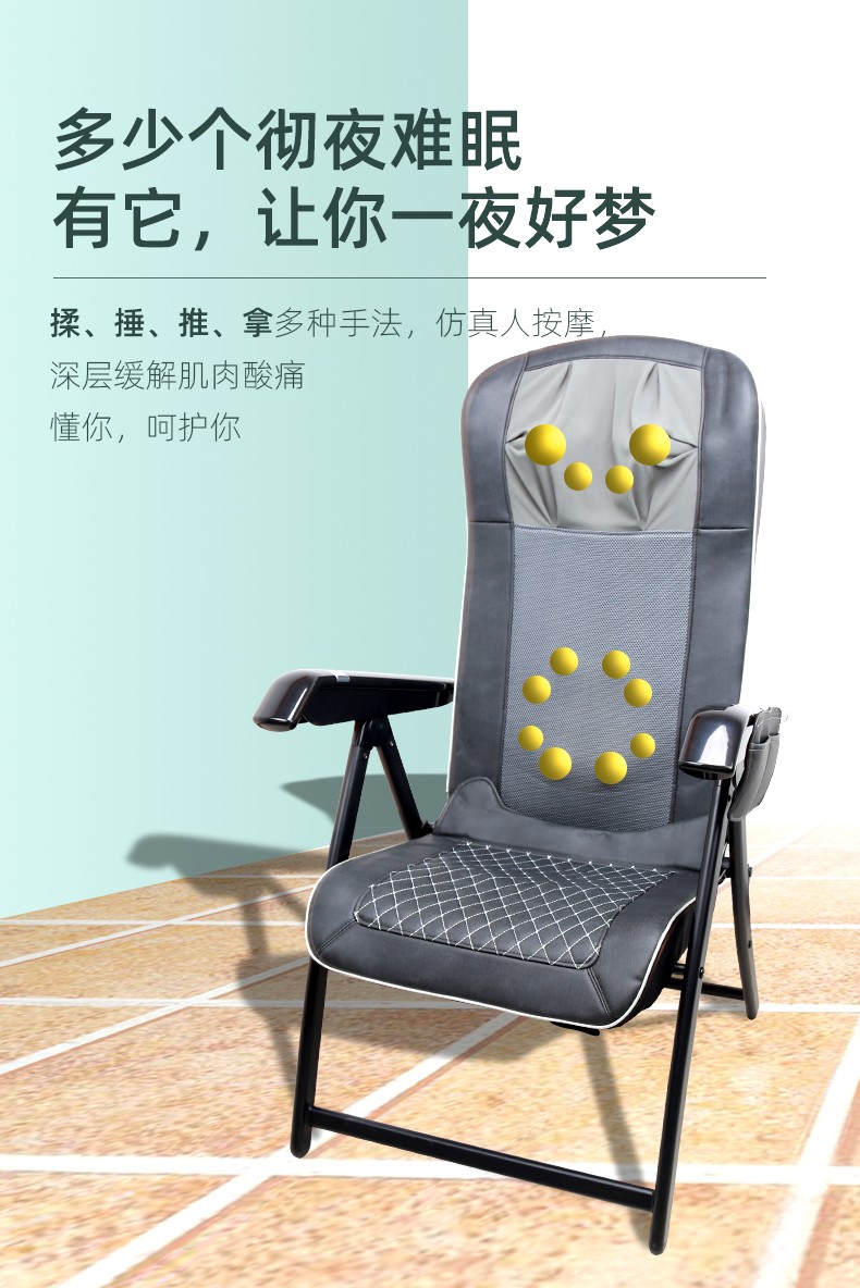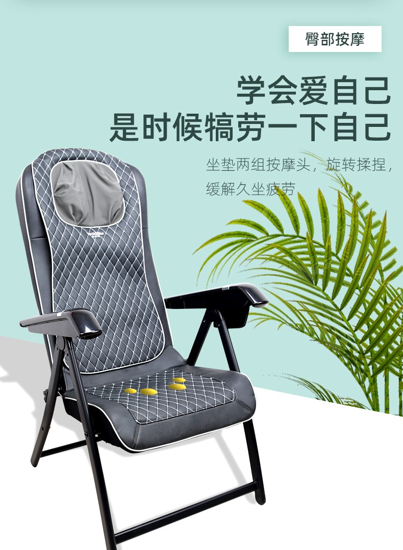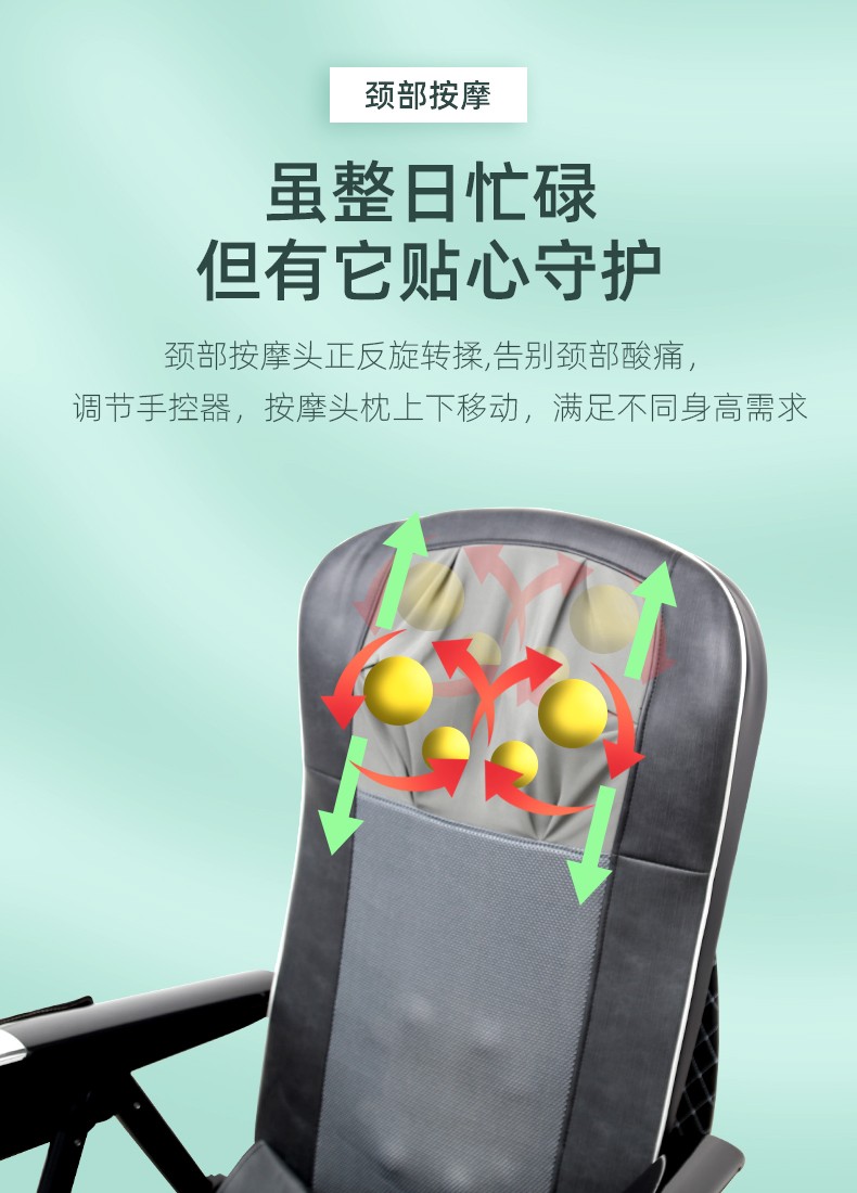 折疊式按摩椅1.頸部:創新壓肩按摩,正反轉揉捏,上下可調節高矮適應不同人。