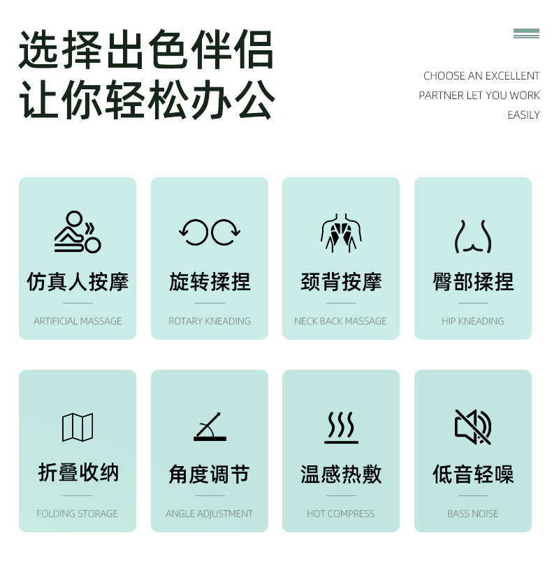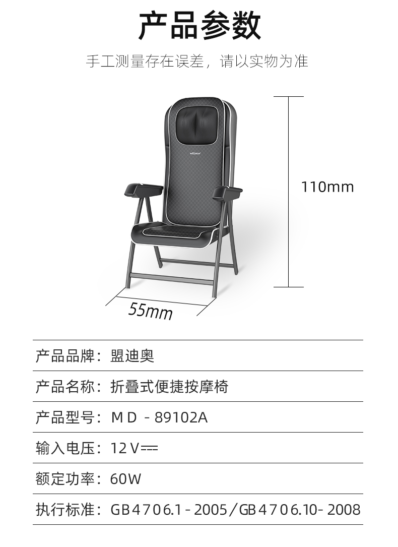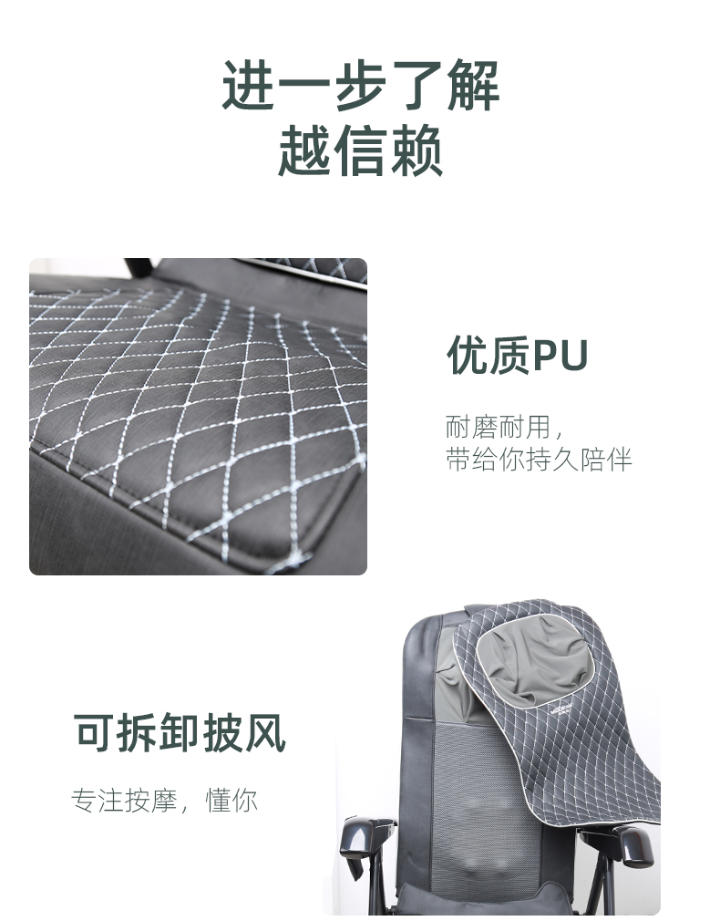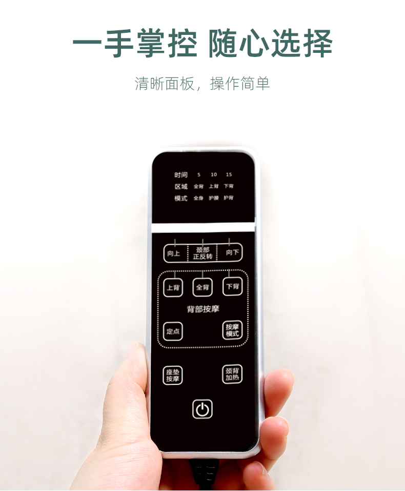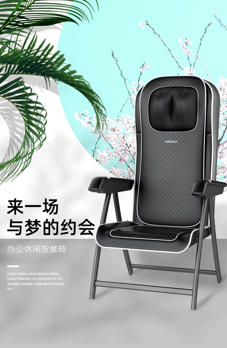 折疊式按摩椅1.頸部:創新壓肩按摩,正反轉揉捏,上下可調節高矮適應不同人。